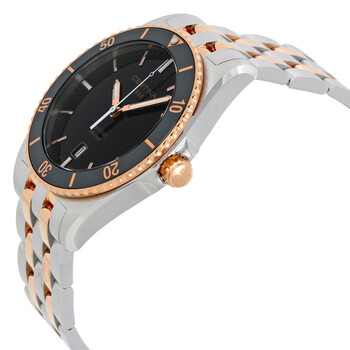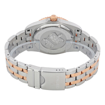 Stainless steel case with a two-tone (silver-tone and rose gold PVD) stainless steel bracelet. Uni-directional rotating rose gold PVD bezel with an inlaid black ceramic ring. Black dial with luminous hands and index hour markers. Minute markers around the outer rim. Dial Type: Analog. Luminescent hands and markers. Date display at the 6 o'clock position. ETA caliber 955.112 quartz movement. Scratch resistant sapphire crystal. Screw down crown. Solid case back. Round case shape. Case size: 41 mm. Case thickness: 13 mm. Band width: 20 mm. Deployment clasp with a push button release. Water resistant at 200 meters / 660 feet. Functions: date, hour, minute, second, battery eol indicator. Ds First Ceramic Series. Dress watch style. Watch label: Swiss Made. Certina DS First Ceramic Black Dial Men's Watch C0144102205100.