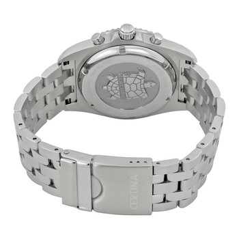 Stainless steel case with a stainless steel bracelet. Uni-directional rotating stainless steel bezel with an inlaid black ceramic ring. Black dial with luminous hands and index hour markers. Minute markers around the outer rim. Dial Type: Analog. Luminescent hands and markers. Date display at the 6 o'clock position. Chronograph - three sub-dials displaying: 60 second, 30 minute and 1/10th of a second. ETA caliber 251.262 quartz movement. Scratch resistant sapphire crystal. Screw down crown. Solid case back. Round case shape. Case size: 41 mm. Case thickness: 13 mm. Band width: 21 mm. Fold over with push button release clasp. Water resistant at 200 meters / 660 feet. Functions: chronograph, date, hour, minute, second. Ds First Ceramic Series. Dress watch style. Watch label: Swiss Made. Certina DS First Ceramic Chronograph Men's Watch C0144171105100.