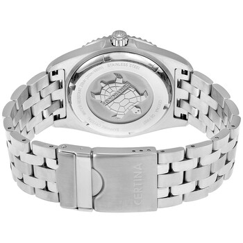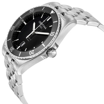 Stainless steel case with a stainless steel bracelet. Rotating black ceramic bezel. Black dial with luminous hands and index hour markers. Minute markers around the outer rim. Dial Type: Analog. Date display at the 6 o'clock position. Quartz movement. Scratch resistant sapphire crystal. Screw down crown. Solid case back. Case diameter: 41 mm. Round case shape. Push button deployment clasp. Water resistant at 200 meters / 660 feet. Functions: date, hour, minute, second. Watch label: Swiss Made. Certina DS First Ceramic Stainless Steel Men's Quartz Watch C0144101105100.