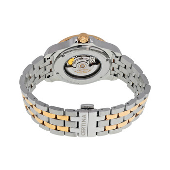 Silver-tone stainless steel case with a two-tone (silver-tone and rose gold-tone) stainless steel bracelet. Fixed rose gold-tone stainless steel bezel. Black dial with luminous rose gold-tone hands and index hour markers. Minute markers around the outer rim. Dial Type: Analog. Luminescent hands and markers. Day of the week and date display at the 3 o'clock position. ETA Caliber 2836-2 Automatic movement, based upon ETA 2824-2, containing 25 Jewels, bitting at 28800 vph, and has a power reserve of approximately 40 hours. Scratch resistant sapphire crystal. Screw down crown. Skeleton case back. Round case shape, case size: 40.33 mm, case thickness: 11.9 mm. Band width: 20 mm. Fold over clasp. Water resistant at 200 meters / 660 feet. Functions: date, day, hour, minute, second. Ds First Day-date Series. Sport watch style. Watch label: Swiss Made. Item Variations: C014 407 22 081 00, C014-407-22-081-00, C014/407/22/081/00, C0144072208100. Certina DS First Day-Date Automatic Black Dial Two-tone Men's Watch C014.407.22.081.00.