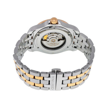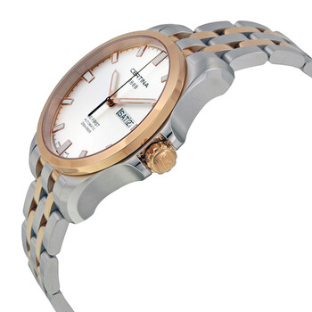 Stainless steel case with a two-tone (silver and rose gold-tone) stainless steel bracelet. Fixed rose gold-tone bezel. Silver dial with luminous rose gold-tone hands and index hour markers. Minute markers around the outer rim. Dial Type: Analog. Luminescent hands and markers. Day of the week and date display at the 3 o'clock position. Automatic movement with a 40 hour power reserve. Scratch resistant sapphire crystal. Skeleton case back. Case diameter: 40.33 mm. Case thickness: 11.9 mm. Round case shape. Fold over clasp. Water resistant at 200 meters / 660 feet. Functions: date, day, hour, minute, second. Sport watch style. Watch label: Swiss Made. Certina DS First Day-Date Automatic Silver Dial Two-tone Men's Watch C014.407.22.031.00.
