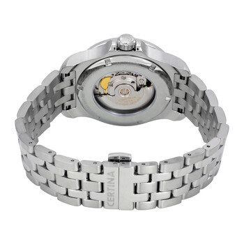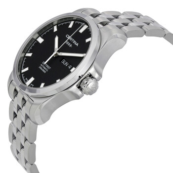 Stainless steel case with a stainless steel bracelet. Fixed stainless steel bezel. Black dial with luminous silver-tone hands and index hour markers. Minute markers around the outer rim. Dial Type: Analog. Luminescent hands and markers. Day of the week and date display at the 3 o'clock position. ETA 2836-2 automatic movement with a 40-hour power reserve. Scratch resistant sapphire crystal. Screw down crown. Skeleton case back. Case size: 40.33 mm. Case thickness: 12 mm. Round case shape. Bracelet width: 20 mm. Deployment clasp with a push button release. Water resistant at 200 meters / 660 feet. Functions: date, hour, minute, second. Casual watch style. Watch label: Swiss Made. Certina DS First Day-Date Automatic Unisex Watch C0144071105100.