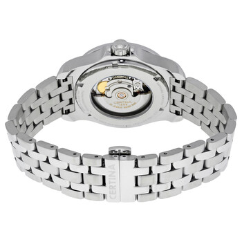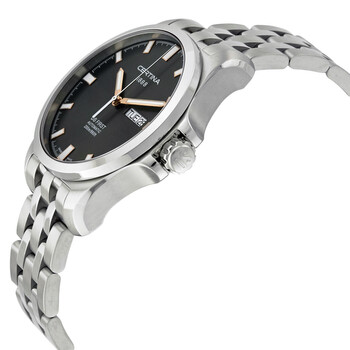 Silver-tone stainless steel case with a silver-tone stainless steel bracelet. Fixed silver-tone stainless steel bezel. Anthracite dial with luminous rose gold-tone hands and index hour markers. Minute markers around the outer rim. Dial Type: Analog. Luminescent hands and markers. Day of the week and date display at the 3 o'clock position. ETA Caliber 2836-2 Automatic movement, based upon ETA 2824-2, containing 25 Jewels, bitting at 28800 vph, and has a power reserve of approximately 40 hours. Scratch resistant sapphire crystal. Screw down crown. Skeleton case back. Round case shape, case size: 40.33 mm, case thickness: 16 mm. Band width: 22 mm. Deployment with push button release clasp. Water resistant at 200 meters / 660 feet. Functions: date, day, hour, minute, second. Ds First Day-date Series. Casual watch style. Watch label: Swiss Made. Certina DS First Day-Date Automatic Unisex Watch C0144071108101.