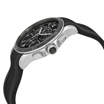 Stainless steel case with a black rubber strap. Fixed stainless steel bezel with a black ceramic top ring. Black dial with silver-tone hands and alternating Arabic numeral and index hour markers. Minute markers around the outer rim. Dial Type: Analog. Date display at the 6 o'clock position. Chronograph - three sub-dials displaying: 60 second, 30 minute and 1/10th of a second. ETA caliber G15.212 AA quartz movement. Scratch resistant mineral crystal. Solid case back. Round case shape. Case size: 38 mm. Case thickness: 12 mm. Band width: 20 mm. Fold over clasp with a push button release. Water resistant at 100 meters / 330 feet. Functions: date, hour, minute, second. Sport watch style. Watch label: Swiss Made. Certina DS First Lady Ceramic Chronograph Black Dial Ladies Watch C030.217.17.057.00.