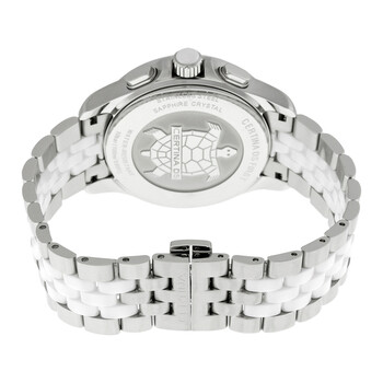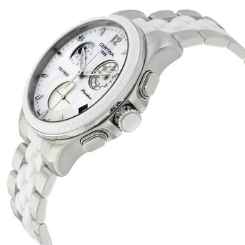 Stainless steel case with a stainless steel bracelet with a pearl white ceramic center links. Fixed stainless steel bezel with pearl white ceramic inllay. Mother of pearl dial with silver-tone skeleton hands and index hour markers. A single crystal is set at the 10 o'clock position. Minute markers around the outer rim. Dial Type: Analog. Date display at the 4 o'clock position. Chronograph - three sub-dials displaying: 60 second, 60 minute and moonphase. Quartz movement. Scratch resistant sapphire crystal. Solid case back. Case size: 38 mm. Case thickness: 12.5 mm. Round case shape. Fold over clasp with a push button release. Water resistant at 100 meters / 330 feet. Functions: chronograph, date, hour, minute, second, moonphase. Dress watch style. Watch label: Swiss Made. Certina DS First Lady Moon Phase Chronograph Ladies Watch C030.250.11.106.00.