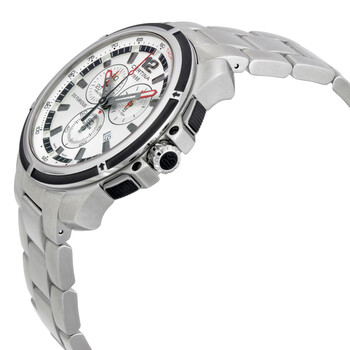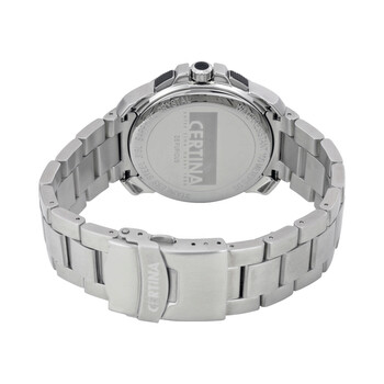 Stainless steel case with a stainless steel bracelet. Fixed black and silver-tone bezel. Silver dial with luminous silver-tone hands and index hour markers. Arabic numeral marks the 12 o'clock position. Minute markers. Tachymeter markings around the outer rim. Dial Type: Analog. Luminescent hands and markers. Date display at the 4 o'clock position. Chronograph - three sub-dials displaying: 60 second, 30 minute and 1/10th of a second. ETA caliber G15.211 quartz movement. Scratch resistant sapphire crystal. Solid case back. Round case shape. Case size: 41.5 mm. Case thickness: 11.2 mm. Band width: 18 mm. Fold over clasp with a safety release. Water resistant at 100 meters / 330 feet. Functions: chronograph, date, hour, minute, second, tachymeter. Dress watch style. Watch label: Swiss Made. Certina DS Furious Chronograph Silver Dial Men's Watch C011.417.21.037.00.