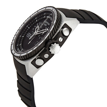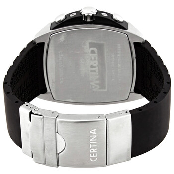 Stainless steel case with a black rubber strap. Fixed black ion-plated bezel with an inlaid silver-tone ring showing tachymeter markings. Black dial with silver-tone skeleton hands and index hour markers. Minute markers. Second markers around the outer rim. Dial Type: Analog. Date display at the 4 o'clock position. Chronograph - three sub-dials displaying: 60 second, 12 hour and 1/10th of a second. ETA caliber 251.233 COSC quartz movement. Scratch resistant sapphire crystal. Screw down crown. Solid case back. Round case shape. Case size: 45 mm. Case thickness: 12.45 mm. Band width: 22 mm. Band length: 8 inches. Deployment clasp with a push button release. Water resistant at 100 meters / 330 feet. Functions: chronograph, rattrapante, date, hour, minute, small second, chronometer. Ds Master Series. Casual watch style. Watch label: Swiss Made. Certina DS Master Chronograph Quartz Chronometer Black Dial Men's Watch C0154342705000.