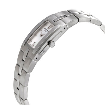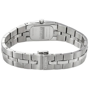 Stainless steel case with a stainless steel bracelet. Fixed stainless steel bezel. Blue dial with silver-tone hands and pryamid hour markers. Arabic numeral markers appear at the 6 and 12 o'clock positions. Dial Type: Analog. Quartz movement. Scratch resistant sapphire crystal. Pull / push crown. Solid case back. Rectangle case shape. Case dimensions: 17.5 mm x 22 mm. Case thickness: 7 mm. Fold over clasp with a safety release. Water resistant at 100 meters / 330 feet. Functions: hour, minute. Ds Mini Donna Series. Dress watch style. Watch label: Swiss Made. Certina DS Mini Donna Quartz Crystal Blue Dial Ladies Watch C0021091111700.