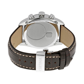 Stainless steel case with a brown leather strap. Fixed stainless steel bezel. Black dial with luminous silver-tone hands and index hour markers. Arabic numerals mark the 3, 6, 9 and 12 o'clock positions. Minute markers around the outer rim. Dial Type: Analog-digital. Luminescent hands and markers. Perpetual calendar display. Digital. ETA caliber E49.351 quartz movement. Scratch resistant sapphire crystal. Solid case back. Case size: 42 mm. Case thickness: 13 mm. Round case shape. Strap width: 22 mm. Tang clasp. Water resistant at 100 meters / 330 feet. Functions: perpetual calendar, chronograph, alarm, year, month, date, day, GMT, second time zone, hour, minute, second, power reserve indicator. Sport watch style. Watch label: Swiss Made. Certina DS Multi-8 Black Dial Brown Leather Men's Watch C020.419.16.057.00.