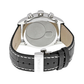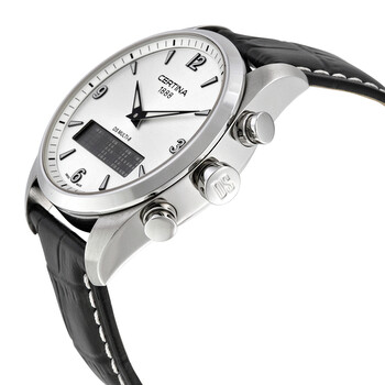 Stainless steel case with a black leather strap. Fixed stainless steel bezel. Silver dial with luminous black hands and index hour markers. Arabic numerals mark the 3, 6, 9 and 12 o'clock positions. Minute markers around the outer rim. Dial Type: Analog-digital. Luminescent hands and markers. Perpetual calendar. Digital display. ETA caliber E49.351 quartz movement. Scratch resistant sapphire crystal. Solid case back. Case size: 42 mm. Case thickness: 13 mm. Round case shape. Strap width: 22 mm. Tang clasp. Water resistant at 100 meters / 330 feet. Functions: perpetual calendar, chronograph, alarm, year, month, date, day, GMT, second time zone, hour, minute, second, power reserve indicator. Sport watch style. Watch label: Swiss Made. Certina DS Multi-8 Silver Dial Black Leather Men's Quartz Watch C020.419.16.037.00.