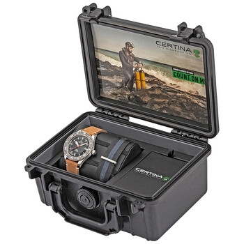 316L stainless steel case with a brown leather strap. Uni-directional rotating stainless steel bezel with a black aluminium ring. Black dial with luminous silver-tone hands and index hour markers. Minute markers around the outer rim. Dial Type: Analog. Luminescent hands and markers. Date display at the 3 o'clock position. Powermatic 80.111 automatic movement with an 80-hour power reserve. Scratch resistant Hesalite crystal. Screw down crown. Solid case back. Round case shape. Case size: 42.8 mm. Case thickness: 13 mm. Band width: 20 mm. Tang clasp. Water resistant at 200 meters / 660 feet. Functions: date, hour, minute, second. Additional Info: additional strap. Casual watch style. Watch label: Swiss Made. Certina DS PH200M Automatic Black Dial Men's Watch C036.407.16.050.00.