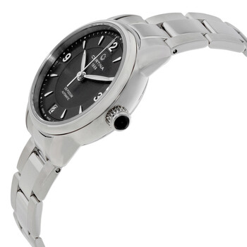 Stainless steel case with a stainless steel bracelet. Fixed stainless steel bezel. Black dial with luminous silver-tone hands and index hour markers. Arabic numerals mark the 3, 9 and 12 o'clock positions. Minute markers around the outer rim. Dial Type: Analog. Luminescent hands and markers. Date display at the 6 o'clock position. ETA 2824-2 automatic movement with a 38-hour power reserve. Scratch resistant sapphire crystal. Pull / push crown. Skeleton case back. Case size: 32.5 mm. Case thickness: 10 mm.Round case shape. Fold over clasp with a push button release. Water resistant at 100 meters / 330 feet. Functions: date, hour, minute, second. Casual watch style. Watch label: Swiss Made. Certina DS Podium Automatic Black Dial Ladies Watch C025.207.11.057.00.