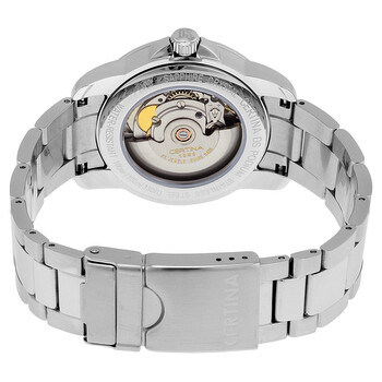 Silver-tone stainless steel case and bracelet. Fixed smooth silver-tone stainless steel bezel. Black dial with luminous hands and index hour markers. Arabic numerals mark the 3, 9 and 12 o'clock positions. Arabic numeral minute markers (at 5 minute intervals). Minute markers around the outer rim. Dial Type: Analog. Luminescent hands and markers. Date display at the 6 o'clock position. ETA Caliber 2824-2 Automatic movement, based upon ETA 2824, containing 25 Jewels, bitting at 28800 vph, and has a power reserve of approximately 38 hours. Scratch resistant sapphire crystal. Pull / push crown. Transparent case back. Round case shape, case size: 38 mm, case thickness: 10 mm. Band width: 21 mm. Fold over clasp with a safety release. Water resistant at 100 meters / 330 feet. Functions: date, hour, minute, second. Ds Podium Series. Casual watch style. Watch label: Swiss Made. Certina DS Podium Automatic Black Dial Men's Watch C0014071105700.