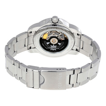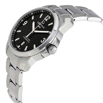Stainless steel case with a stainless steel bracelet. Fixed stainless steel bezel. Black dial with luminous fill silver-tone hands and index hour markers. Arabic numerals mark the 3, 9 and 12 o'clock positions. Minute markers around the outer rim. Dial Type: Analog. Luminescent hands. Date display at the 6 o'clock position. Certina calibre Powermatic 80 (ETA C07.111) automatic movement, based upon ETA 2824-2, containing 23 Jewels, bitting at 21600 vph, and has a power reserve of approximately 80 hours. Scratch resistant sapphire crystal. Transparent case back. Round case shape. Case size: 38 mm. Case thickness: 10.5 mm. Band width: 19 mm. Fold over clasp with a push button release. Water resistant at 100 meters / 330 feet. Functions: date, hour, minute, second. Ds Podium Series. Dress watch style. Watch label: Swiss Made. Item Variations: C0344071105700. Certina DS Podium Automatic Black Dial Men's Watch C034.407.11.057.00.