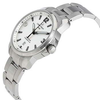 Stainless steel case with a stainless steel bracelet. Fixed stainless steel bezel. Silver dial with luminous fill silver-tone hands and index hour markers. Arabic numerals mark the 3, 9 and 12 o'clock positions. Minute markers around the outer rim. Dial Type: Analog. Luminescent hands. Date display at the 6 o'clock position. Certina calibre Powermatic 80 (ETA C07.111) automatic movement, based upon ETA 2824-2, containing 23 Jewels, bitting at 21600 vph, and has a power reserve of approximately 80 hours. Scratch resistant sapphire crystal. Transparent case back. Round case shape. Case size: 38 mm. Case thickness: 10.5 mm. Band width: 19 mm. Deployment clasp with a push button release. Water resistant at 100 meters / 330 feet. Functions: date, hour, minute, second. Ds Podium Series. Dress watch style. Watch label: Swiss Made. Item Variations: C0344071103700. Certina DS Podium Automatic Silver Dial Men's Watch C034.407.11.037.00.