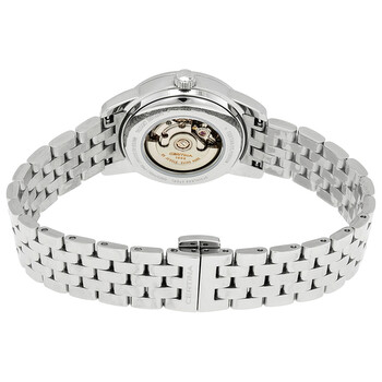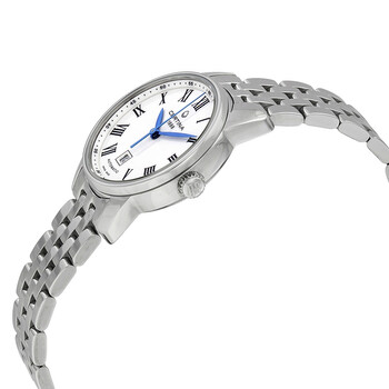 Stainless steel case with a stainless steel bracelet. Fixed stainless steel bezel. White dial with blue hands and Roman numeral hour markers. Minute markers around the outer rim. Dial Type: Analog. Date display above the 6 o'clock position. Automatic movement. Scratch resistant sapphire crystal. Push / pull crown. Transparent case back. Round case shape. Case size: 29 mm. Case thickness: 9 mm. Band width: 14 mm. Deployment clasp with a push button release. Water resistant at 100 meters / 330 feet. Functions: date, hour, minute, second. Casual watch style. Watch label: Swiss Made. Certina DS Podium Automatic White Dial Ladies Watch C001.007.11.013.00.