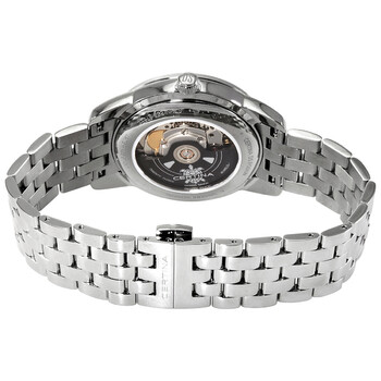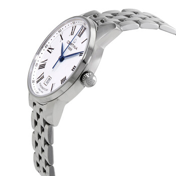 Silver-tone stainless steel case and bracelet. Fixed silver-tone stainless steel bezel. White dial with blue hands and Roman numeral hour markers. Arabic numeral minute markers (at 5 minute intervals). Minute markers around the outer rim. Dial Type: Analog. Date display above the 6 o'clock position. ETA Caliber 2836-2 Automatic movement, based upon ETA 2824-2, containing 25 Jewels, bitting at 28800 vph, and has a power reserve of approximately 40 hours. Scratch resistant sapphire crystal. Pull / push crown. Transparent case back. Round case shape, case size: 39 mm, case thickness: 9.8 mm. Band width: 19 mm. Fold over clasp with a push button release. Water resistant at 100 meters / 330 feet. Functions: date, hour, minute, second. Ds Podium Series. Casual watch style. Watch label: Swiss Made. Certina DS Podium Automatic White Dial Men's Watch C0348071101300.