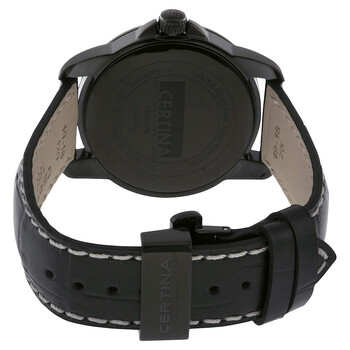 Black PVD stainless steel case with a black leather strap. Fixed black PVD bezel. Black dial with luminous silver-tone hands and index hour markers. Arabic numerals mark the 3, 9 and 12 o'clock positions. Minute markers around the outer rim. Dial Type: Analog. Luminescent hands and markers. Date display at the 6 o'clock position. Quartz movement. Scratch resistant sapphire crystal. Solid case back. Case diameter: 38 mm. Case thickness: 9 mm. Round case shape. Tang clasp. Water resistant at 100 meters / 330 feet. Functions: date, hour, minute, second. Casual watch style. Watch label: Swiss Made. Certina DS Podium Black Dial Black Leather Men's Quartz Watch C0014101605702.