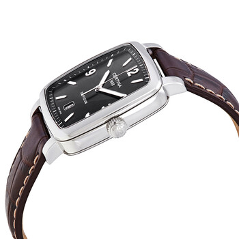 Stainless steel case with a brown leather strap. Fixed stainless steel bezel. Black dial with luminous silver-tone hands and index hour markers. Arabic numerals appear at the 3, 9 and 12 o'clock positions. Minute markers around the outer rim. Dial Type: Analog. Luminescent hands and markers. Date display at the 6 o'clock position. Quartz movement. Scratch resistant sapphire crystal. Pull / push crown. Solid case back. Square case shape. Case size: 38 mm. Deployment clasp. Water resistant at 100 meters / 330 feet. Functions: date, hour, minute, second. Casual watch style. Watch label: Swiss Made. Certina DS Podium Black Dial Leather C0255101605701.