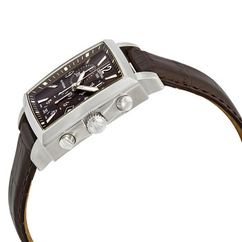 Stainless steel case with a brown leather strap. Fixed stainless steel bezel. Brown dial with luminous silver-tone hands and index hour markers. Arabic numerals mark the 3, 9 and 12 o'clock positions. Minute markers around the outer rim. Dial Type: Analog. Luminescent hands and markers. Date display at the 4 o'clock position. Chronograph - three sub-dials displaying: 60 second, 30 minute and 12 hours. Quartz movement. Scratch resistant sapphire crystal. Pull / push crown. Transparent case back. Square case shape. Case size: 32 mm. Case thickness: 11 mm. Band width: 19 mm. Band length: 7 inches. Double fold over clasp. Water resistant at 100 meters / 330 feet. Functions: chronograph, date, hour, minute, second. Casual watch style. Watch label: Swiss Made. Certina DS Podium Chronograph Brown Dial Ladies Watch C001.317.16.297.00.