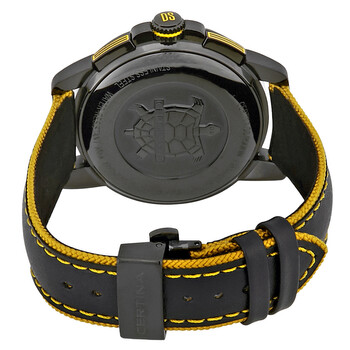 Black PVD stainless steel case with a black leather strap with yellow trim. Fixed black PVD bezel showing tachymeter markings. Black dial with yellow hands and index hour markers. Arabic numerals mark the 3, 9 and 12 o'clock positions. Minute markers around the outer rim. Dial Type: Analog. Luminescent hands and markers. Date display at the 4 o'clock position. Chronograph - three sub-dials displaying: 60 second, 30 minute and 1/10th of a second. ETA caliber G10.212 AJ Precidrive quartz movement. Scratch resistant sapphire crystal. Pull / push crown. Solid case back. Case size: 42 mm. Case thickness: 11.7 mm. Round case shape. Band width: 22 mm. Butterfly clasp. Water resistant at 100 meters / 330 feet. Functions: chronograph, rattrapante, date, hour, minute, small second, chronometer. Casual watch style. Watch label: Swiss Made. Certina DS Podium Chronograph Chronometer Men's Watch C034.453.36.057.10.