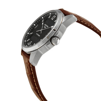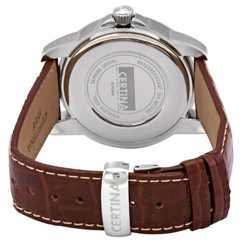 Stainless steel case with a brown leather strap. Fixed stainless steel bezel. Black dial with silver-tone hands and index hour markers. Arabic Numerals appear at the 3, 6, 9 and 12 o'clock positions. Minute markers around the outer rim. Arabic numeral markers at the 3, 6, 9 and 12 o'clock positions. Digital sub-dial. Dial Type: Analog-Digital. ETA 988.333 quartz movement. Scratch resistant sapphire crystal. Round case shape. Case size: 40 mm. Strap width: 20 mm. Tang clasp. Water resistant at 100 meters / 330 feet. Functions: electronic LCD, week day, GMT (dual time), timer, chronograph, date, hour, minute. Ds Podium Series. Sport watch style. Watch label: Swiss Made. Certina DS Podium Chronograph Quartz Analog-Digital Black Dial Men's Watch C19370294266.