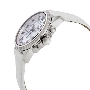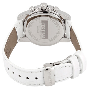 Stainless steel case with a white leather strap. Fixed stainless steel bezel set with diamonds. Mother of pearl dial with luminous grey hands and index hour markers. Arabic numeral markers at the 3, 9 and 12 o'clock positions. Minute markers around the outer rim. Dial Type: Analog. Luminescent hands. Date display at the 4 o'clock position. Chronograph - three sub-dials displaying: 60 second, 30 minute and 1/10th of a second. ETA caliber 251.471 quartz movement. Scratch resistant sapphire crystal. Solid case back. Round case shape. Case size: 34 mm. Case thickness: 10.1 mm. Band width: 17 mm. Fold over clasp. Water resistant at 100 meters / 330 feet. Functions: chronograph, date, hour, minute, small second. Ds Podium Series. Sport watch style. Watch label: Swiss Made. Certina DS Podium Chronograph Quartz Mother of Pearl Dial Diamond Ladies Watch C0012171611710.