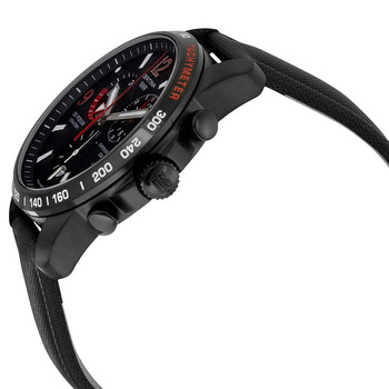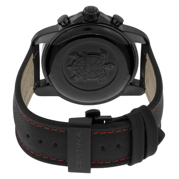 Black PVD stainless steel case with a black leather strap. Fixed black PVD bezel showing tachymeter markings. Black dial with luminous hands and index hour markers. Arabic numerals mark the 3, 9 and 12 o'clock positions. Minute markers around the outer rim. Dial Type: Analog. Luminescent hands and markers. Date display at the 6 o'clock position. Chronograph - three sub-dials displaying: 60 second, dual 60 minute / 12 hour and 24 hour (GMT). Quartz movement. Scratch resistant sapphire crystal. Solid case back. Case diameter: 42 mm. Case thickness: 12 mm. Round case shape. Band width: 20 mm. Deployment clasp with a push button release. Water resistant at 100 meters / 330 feet. Functions: chronograph, GMT, date, hour, minute, second. Casual watch style. Watch label: Swiss Made. Certina DS Podium GMT Black Dial Black Leather Men's Quartz Watch C0016391605702.