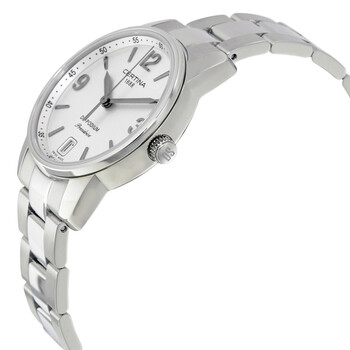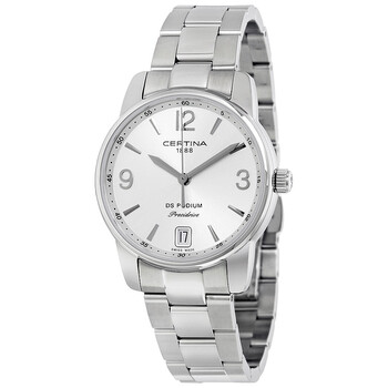 Stainless steel case with a stainless steel bracelet. Fixed stainless steel bezel. Silver dial with grey hands and index hour markers. Arabic numerals mark the 3, 9 and 12 o'clock positions. Minute markers around the outer rim. Dial Type: Analog. Date display at the 6 o'clock position. Quartz movement. Scratch resistant sapphire crystal. Solid case back. Case size: 33 mm. Case thickness: 8.6 mm. Round case shape. Band width: 16 mm. Deployment clasp. Water resistant at 100 meters / 330 feet. Functions: date, hour, minute, second. Dress watch style. Watch label: Swiss Made. Certina DS Podium Lady Watch C034.210.11.037.00.