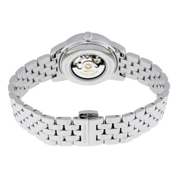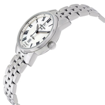 Stainless steel case with a stainless steel bracelet. Fixed stainless steel bezel. Mother of pearl dial with silver-tone leaf-style hands and Roman numeral hour markers. Minute markers around the outer rim. Dial Type: Analog. Date display above the 6 o'clock position. ETA caliber 2671 automatic movement, containing 25 Jewels, bitting at 28800 vph, and has a power reserve of approximately 38 hours. Scratch resistant sapphire crystal. Transparent case back. Round case shape. Case size: 29 mm. Case thickness: 9.2 mm. Fold over clasp. Water resistant at 100 meters / 330 feet. Functions: date, hour, minute, second. Casual watch style. Watch label: Swiss Made. Certina DS Podium Mother of Pearl Dial Ladies Watch C001.007.11.113.00.