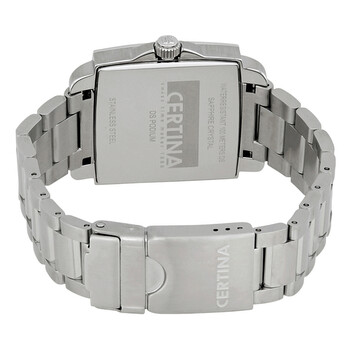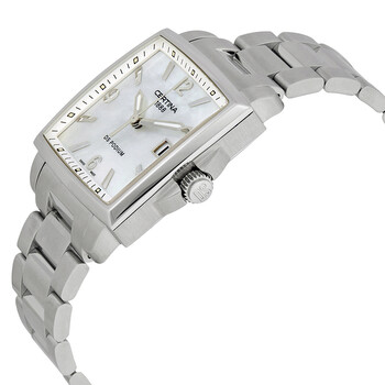 Stainless steel case with a stainless steel bracelet. Fixed stainless steel bezel. White mother of pearl dial with luminous silver-tone hands and index hour markers. Arabic numerals mark the 6, 9 and 12 o'clock positions. Minute markers around the outer rim. Dial Type: Analog. Luminescent hands and markers. Date display at the 3 o'clock position. ETA caliber F06.161 quartz movement. Scratch resistant sapphire crystal. Solid case back. Case size: 32 mm. Case thickness: 11.7 mm. Cushion case shape. Bracelet width: 16 mm. Deployment clasp. Water resistant at 100 meters / 330 feet. Functions: date, hour, minute, second, battery eol indicator. Additional Info: suitable for snorkeling as well as swimming but not diving. Casual watch style. Watch label: Swiss Made. Certina DS Podium Mother of Pearl Dial Ladies Watch C001.310.11.117.00.