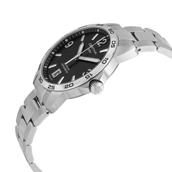 Stainless steel case with a stainless steel bracelet. Fixed stainless steel bezel. Black dial with luminous silver-tone hands and index hour markers. Arabic numerals mark the 3, 9 and 12 o'clock positions. Minute markers around the outer rim. Dial Type: Analog. Luminescent hands and markers. Date display at the 6 o'clock position. PrecidriveTM quartz movement. Scratch resistant sapphire crystal. Screw down crown. Solid case back. Round case shape. Case size: 40 mm. Case thickness: 9.42 mm. Band width: 20 mm. Fold over clasp. Water resistant at 100 meters / 330 feet. Functions: date, hour, minute, second. Ds Podium Series. Casual watch style. Watch label: Swiss Made. Certina DS Podium Quartz Black Dial Watch C034.451.11.057.00.
