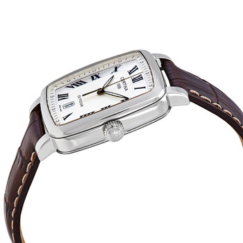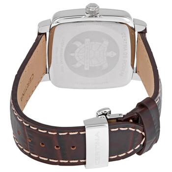 Stainless steel case with a brown leather strap. Fixed stainless steel bezel. Silver dial with luminous black hands and Roman numeral hour markers. Minute markers around the outer rim. Dial Type: Analog. Luminescent hands and markers. Date display at the 6 o'clock position. Quartz movement. Scratch resistant sapphire crystal. Pull / push crown. Solid case back. Square case shape. Case size: 38 mm. Case thickness: 10 mm. Band width: 21 mm. Deployment clasp. Water resistant at 100 meters / 330 feet. Functions: date, hour, minute, second. Ds Podium Series. Casual watch style. Watch label: Swiss Made. Certina DS Podium Quartz Silver Dial Men's Watch C0255101603301
