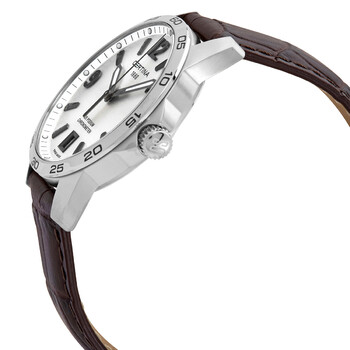 Stainless steel case with a stainless steel bracelet. Fixed stainless steel bezel. Silver dial with luminous silver-tone hands and index hour markers. Arabic numerals mark the 3, 9 and 12 o'clock positions. Minute markers around the outer rim. Dial Type: Analog. Luminescent hands and markers. Date display at the 6 o'clock position. PrecidriveTM quartz movement. Scratch resistant sapphire crystal. Screw down crown. Solid case back. Round case shape. Case size: 40 mm. Case thickness: 9.42 mm. Band width: 20 mm. Fold over clasp. Water resistant at 100 meters / 330 feet. Functions: date, hour, minute, second. Ds Podium Series. Casual watch style. Watch label: Swiss Made. Certina DS Podium Quartz Silver Dial Watch C034.451.16.037.00.