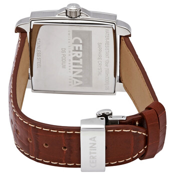 Stainless steel case with a brown leather strap. Fixed stainless steel bezel. Silver dial with luminous silver-tone hands and alternating Arabic numeral and index hour markers. Minute markers around the outer rim. Dial Type: Analog. Luminescent hands and markers. Date display between the 4 and 5 o'clock positions. ETA-Valjoux caliber 7750 quartz movement with a 44-hour power reserve. Scratch resistant sapphire crystal. Transparent case back. Square case shape. Case size: 37.50 mm. Case thickness: 10.5 mm. Band width: 20 mm. Deployment clasp. Water resistant at 100 meters / 330 feet. Functions: date, hour, minute, second. Casual watch style. Watch label: Swiss Made. Certina DS Podium Silver Dial Men's Watch C0015101603701.