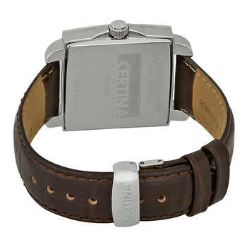 Stainless steel case with a brown leather strap. Fixed stainless steel bezel. Brown dial with luminous silver-tone hands and index hour markers. Arabic numerals mark the 6, 9 and 12 o'clock positions. Minute markers around the outer rim. Dial Type: Analog. Luminescent hands and markers. Date display at the 3 o'clock position. Quartz movement. Scratch resistant sapphire crystal. Pull / push crown. Solid case back. Case size: 32 mm. Case thickness: 11.2 mm. Square case shape. Fold over clasp. Water resistant at 100 meters / 330 feet. Functions: date, hour, minute, second. Dress watch style. Watch label: Swiss Made. Certina DS Podium Square Brown Dial Ladies Watch C001.310.16.297.00.