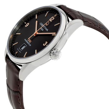 Stainless steel case with a brown leather strap. Fixed stainless steel bezel. Grey dial with luminous rose gold-tone hands and index hour markers. Arabic numerals mark the 3, 9 and 12 o'clock positions. Minute markers around the outer rim. Dial Type: Analog. Luminescent hands and markers. Date display at the 6 o'clock position. Powermatic 80 automatic movement with an 80-hour power reserve. Scratch resistant sapphire crystal. Pull / push crown. Transparent case back. Case size: 40 mm. Case thickness: 11 mm. Round case shape. Band width: 20 mm. Tang clasp. Water resistant at 100 meters / 330 feet. Functions: date, hour, minute, second. Casual watch style. Watch label: Swiss Made. Certina DS Powermatic Automatic Men's Watch C026.407.16.087.01.