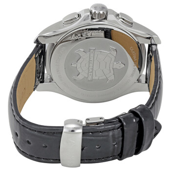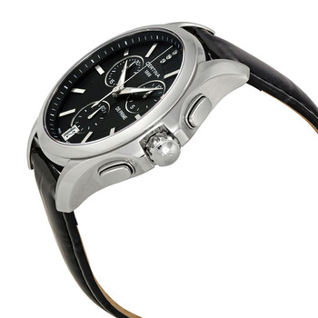 Stainless steel case with a black (calfskin) leather strap. Fixed stainless steel bezel. Black dial with luminous silver-tone hands and index hour markers. Diamond-filled index at the 12 o'clock position. Minute markers around the outer rim. Dial Type: Analog. Luminescent hands and markers. Date display at the 6 o'clock position. Chronograph - three sub-dials displaying: 60 second, 30 minute and 1/10th of a second. ETA caliber G10.211 quartz movement. Scratch resistant sapphire crystal. Screw down crown. Solid case back. Round case shape. Case size: 39 mm. Case thickness: 12 mm. Band width: 18 mm. Fold over clasp with a push button release. Water resistant at 100 meters / 330 feet. Functions: date, hour, minute, second. Sport watch style. Watch label: Swiss Made. Certina DS Prime Chronograph Black Dial Ladies Watch C004.217.16.056.00.