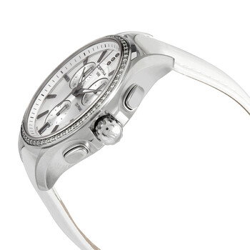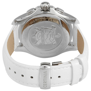 Stainless steel case with a white leather strap. Fixed stainless steel bezel set with diamonds. Silver dial with black hands and index hour markers. Black diamond-set index marker at the 12 o'clock position. Minute markers around the outer rim. Dial Type: Analog. Date display at the 6 o'clock position. Chronograph - three sub-dials displaying: 60 second, 30 minute and 1/10th of a second. ETA caliber G10.211 quartz movement. Scratch resistant sapphire crystal. Solid case back. Round case shape. Case size: 39 mm. Case thickness: 11.05 mm. Tang clasp. Water resistant at 100 meters / 330 feet. Functions: chronograph, date, hour, minute, second. Ds Prime Chronograph Series. Sport watch style. Watch label: Swiss Made. Certina DS Prime Chronograph Quartz Diamond Silver Dial Ladies Watch C004.217.66.036.00.