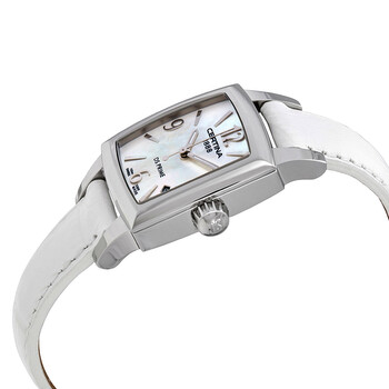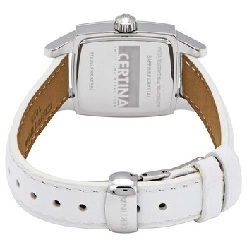 Stainless steel case with a white leather strap. Fixed stainless steel bezel. White mother of pearl dial with luminous silver-tone hands and index hour markers. Arabic numerals appear at the 3, 6, 9 and 12 o'clock positions. Dial Type: Analog. Luminescent hands. Date display between the 4 and 5 o'clock positions. ETA caliber F03.111 quartz movement. Scratch resistant sapphire crystal. Pull / push crown. Solid case back. Tonneau case shape. Case dimensions: 27 mm x 25 mm. Case thickness: 8.7 mm. Band width: 13 mm. Fold over clasp. Water resistant at 100 meters / 330 feet. Functions: date, hour, minute, second, battery eol indicator. Ds Prime Series. Dress watch style. Watch label: Swiss Made. Certina DS Prime Mother of Pearl Dial Ladies Watch C004.310.16.117.00.