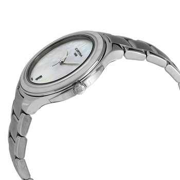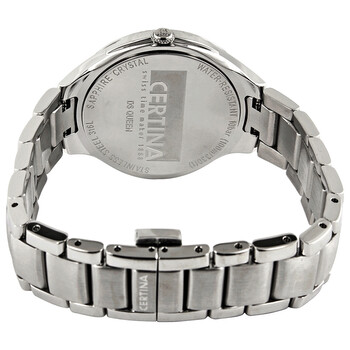 Stainless steel case with a stainless steel bracelet. Fixed stainless steel bezel. Mother of pearl dial with silver-tone hands. No markers. Dial Type: Analog. Date display at the 6 o'clock position. ETA caliber F06.111 quartz movement. Scratch resistant sapphire crystal. Solid case back. Round case shape. Case size: 36 mm. Case thickness: 9.5 mm. Hidden fold over clasp. Water resistant at 100 meters / 330 feet. Functions: date, hour, minute, second. Ds Queen Series. Casual watch style. Watch label: Swiss Made. Certina DS Queen Quartz Ladies Watch C018.210.11.110.00.