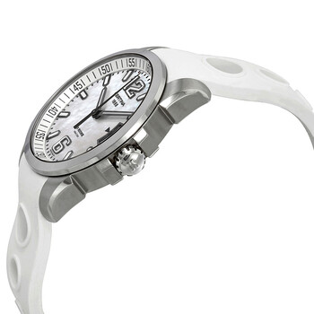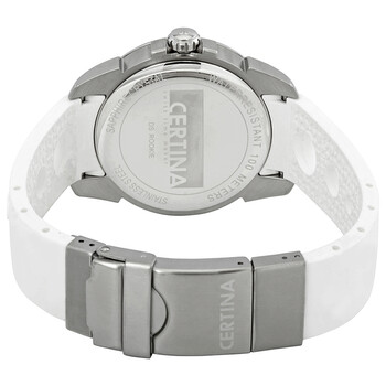 Stainless steel case with a white rubber strap. Fixed stainless steel bezel. White mother of pearl dial with luminous silver-tone hands and index hour markers. Arabic numerals mark the 6 and 12 o'clock positions. Minute markers around the outer rim. Dial Type: Analog. Luminescent hands and markers. Date display at the 3 o'clock position. ETA caliber F07.111 quartz movement. Scratch resistant sapphire crystal. Pull / push crown. Solid case back. Round case shape. Case size: 40 mm. Case thickness: 11.7 mm. Band width: 20 mm. Band length: 8.5 inches. Deployment clasp. Water resistant at 100 meters / 330 feet. Functions: date, hour, minute, second. Sport watch style. Watch label: Swiss Made. Certina DS Rookie Mother of Pearl Dial Unisex Watch C016.410.17.117.00.