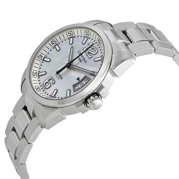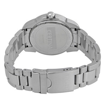 Stainless steel case with a stainless steel bracelet. Fixed stainless steel bezel. Silver dial with luminous silver-tone hands and index hour markers. Arabic numerals mark the 6 and 12 o'clock positions. Minute markers around the outer rim. Dial Type: Analog. Luminescent hands and markers. Date display at the 3 o'clock position. ETA Caliber F07.111 quartz movement. Scratch resistant sapphire crystal. Solid case back. Case size: 40 mm. Case thickness: 12 mm. Round case shape. Band width: 20 mm. Deployment clasp. Water resistant at 100 meters / 330 feet. Functions: date, hour, minute, second. Casual watch style. Watch label: Swiss Made. Certina DS Rookie Silver Dial Men's Watch C016.410.11.117.00.