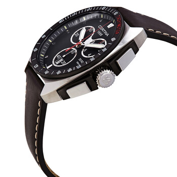 Stainless steel case with a brown leather strap. Fixed black-plated bezel showing tachymeter markings. Black dial with luminous silver-tone hands and index hour markers. Minute markers around the outer rim. Dial Type: Analog. Luminescent hands and markers. Date display at the 6 o'clock position. Chronograph - three sub-dials displaying: 60 second, 30 minute and 1/10th of a second. Quartz movement. Scratch resistant sapphire crystal. Solid case back. Round case shape. Case size: 41 mm. Case thickness: 10 mm. Band width: 22 mm. Deployment clasp. Water resistant at 100 meters / 330 feet. Functions: chronograph, date, hour, minute, second. Ds Royal Series. Sport watch style. Watch label: Swiss Made. Certina DS Royal Chronograph Quartz Black Dial Men's Watch C010.417.16.051.00.
