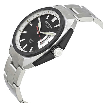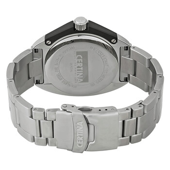 Stainless steel case with a stainless steel bracelet. Fixed black PVD bezel. Black dial with luminous silver-tone hands and index hour markers. Dial Type: Analog. Luminescent hands. Date display at the 3 o'clock position. ETA caliber 955.112 quartz movement. Scratch resistant sapphire crystal. Push / pull crown. Solid case back. Round case shape. Case size: 42 mm. Case thickness: 12 mm. Band width: 22 mm. Fold over clasp with a push button release. Water resistant at 100 meters / 330 feet. Functions: date, hour, minute, second. Additional Info: battery end of life indicator. Casual watch style. Watch label: Swiss Made. Item Variations: C0104101105100. Certina DS Royal Quartz Black Dial Men's Watch C010.410.11.051.00.