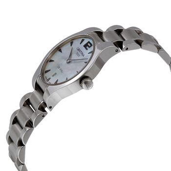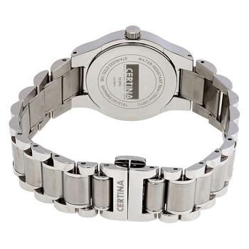 Stainless steel case with a two-tone (silver-tone and grey-tone) stainless steel bracelet. Fixed stainless steel bezel. Mother of pearl dial with black hands and index hour markers. An Arabic numeral appears at the 12 o'clock positions. Dial Type: Analog. Date display above the 6 o'clock position. ETA caliber 956.112 quartz movement. Scratch resistant sapphire crystal. Pull / push crown. Solid case back. Round case shape. Case size: 30 mm. Case thickness: 7 mm. Deployment clasp with a push button release. Water resistant at 100 meters / 330 feet. Functions: date, hour, minute. Ds Spel Lady Series. Dress watch style. Watch label: Swiss Made. Certina DS Spel Lady Mother of Pearl Dial Ladies Watch C012.209.11.117.00.
