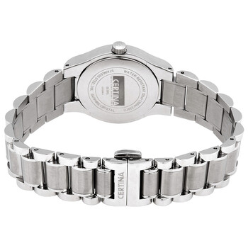 Stainless steel case with a stainless steel bracelet. Fixed stainless steel bezel set with 40 diamonds. White mother of pearl dial with black hands and index hour markers. An Arabic numeral appears at the 12 o'clock position. Dial Type: Analog. Date display at the 6 o'clock position. ETA caliber 956.112 quartz movement. Scratch resistant sapphire crystal. Pull / push crown. Solid case back. Round case shape. Case size: 30 mm. Case thickness: 7 mm. Band width: 18 mm. Deployment clasp with a push button release. Water resistant at 100 meters / 330 feet. Functions: date, hour, minute. Dress watch style. Watch label: Swiss Made. Certina DS Spel Lady Round Quartz Diamond White Mother of Pearl Dial Ladies Watch C012.209.61.117.00.