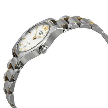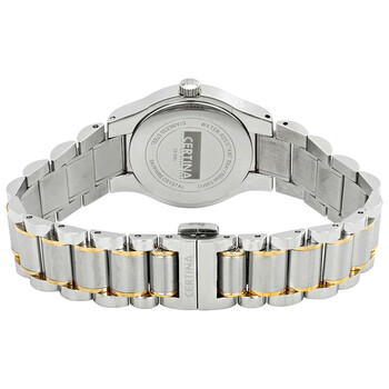 Stainless steel case with a two-tone (silver-tone and yellow gold-tone) stainless steel bracelet. Fixed stainless steel bezel. White mother of pearl dial with yellow gold-tone hands and index hour markers. An Arabic numeral appears at the 12 o'clock position. Dial Type: Analog. Date display at the 6 o'clock position. ETA caliber 956.112 quartz movement. Scratch resistant sapphire crystal. Pull / push crown. Solid case back. Round case shape. Case size: 30 mm. Case thickness: 7 mm. Bracelet width: 20 mm. Deployment clasp with a push button release. Water resistant at 100 meters / 330 feet. Functions: date, hour, minute. Casual watch style. Watch label: Swiss Made. Certina DS Spel Lady Round White Mother of Pearl Dial Ladies Watch C012.209.22.037.00.