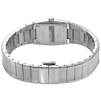 Grey titanium case with a grey titanium bracelet. Fixed grey titanium bezel. Grey dial with silver-tone hands and index hour markers. Arabic numerals appear at the 6 and 12 o'clock positions. Dial Type: Analog. Quartz movement. Scratch resistant sapphire crystal. Pull / push crown. Solid case back. Square case shape. Case size: 19.5 mm. Case thickness: 6.6 mm. Fold over clasp with a safety release. Water resistant at 100 meters / 330 feet. Functions: hour, minute. Ds Spel Mini Lady Series. Dress watch style. Watch label: Swiss Made. Certina DS Spel Mini Lady Quartz Grey Dial Ladies Watch C32271571266.