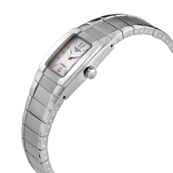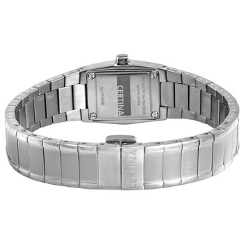 Grey titanium case and bracelet. Fixed grey titanium bezel. Silver dial with silver-tone hands and index hour markers. Arabic numerals appear at the 6 and 12 o'clock positions. Dial Type: Analog. Quartz movement. Scratch resistant sapphire crystal. Pull / push crown. Solid case back. Tonneau case shape. Case dimensions: 28.7 mm x 32 mm. Case thickness: 6.7 mm. Band width: 13 mm. Deployment clasp with a push button release. Water resistant at 100 meters / 330 feet. Functions: hour, minute, second. Ds Spel Series. Casual watch style. Watch label: Swiss Made. Certina DS Spel Quartz Silver Dial Ladies Watch C32271571296.